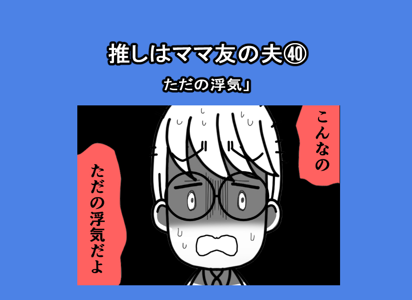 推しはママ友の夫㊵「ただの浮気」 2026.03.31 推しはママ友の夫 コミックエッセイ, 体験談 前回 推しはママ友の夫㊴「捨てる」 本編 広告 広告 あとがき つづき 14 コメントはこちら 同じカテゴリの記事 推しはママ友の夫㊵「ただの浮気」 推しはママ友の夫㊴「捨てる」 推しはママ友の夫㊳「あの人以外全部邪魔」 推しはママ友の夫㊲「わかってない」 推しはママ友の夫㊱「不審」 推しはママ友の夫㉟「話し合い」 推しはママ友の夫㉞「企む」 推しはママ友の夫㉝「拒絶」 推しはママ友の夫㉜「私ならわかってあげられる」 推しはママ友の夫㉛「一緒に帰ってあげる」 推しはママ友の夫㉚「激怒」 推しはママ友の夫㉙「我が子を優先しなさい」 推しはママ友の夫㉘「拒否」 推しはママ友の夫㉗「パパの代わりにきた人物」 推しはママ友の夫㉖「同じになってほしい」 推しはママ友の夫㉕「キレる」 推しはママ友の夫㉔「実子のおねだりに…」 推しはママ友の夫㉓「ユミさんより私のほうが」 推しはママ友の夫㉒「推しを待受にするのは当然」 推しはママ友の夫㉑「推しの好みに合わせるのは当然」 推しはママ友の夫⑳「推しのためにイメチェン」 推しはママ友の夫⑲「どうしたら喜んでもらえる?」 推しはママ友の夫⑱「私だから話してくれた」 推しはママ友の夫⑰「推しの想いを聞いて…」 推しはママ友の夫⑯「ユミさんになりたい」 推しはママ友の夫⑮「絶対にダメ!!」 推しはママ友の夫⑭「水をさされて…」 推しはママ友の夫⑬「羨ましい」 推しはママ友の夫⑫「推しとして!好き」 推しはママ友の夫⑪「すき」 推しはママ友の夫⑩「陽キャにヲタクがバレる!!」 推しはママ友の夫⑨「嫉妬しないの?」 推しはママ友の夫⑧「推しとの出会い⑥」 推しはママ友の夫⑦「推しとの出会い⑤」 推しはママ友の夫⑥「推しとの出会い④」 推しはママ友の夫⑤「推しとの出会い③」 推しはママ友の夫④「推しとの出会い②」 推しはママ友の夫③「推しとの出会い①」 推しはママ友の夫②「週1で会える推し」 推しはママ友の夫①「これは不倫や浮気じゃない」 前の記事 推しはママ友の夫㊴「捨てる」 2026.03.30 次の記事 記事がありません アプリなら通知ですぐ読める! NAPBIZブログ This site is protected by reCAPTCHA and the Google Privacy Policy and Terms of Service apply.