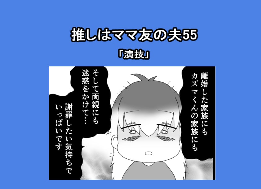 推しはママ友の夫55「演技」 2026.04.28 推しはママ友の夫 コミックエッセイ, 体験談 前回 推しはママ友の夫54「その後の二人」 本編 広告 広告 あとがき つづき 24 コメントはこちら 同じカテゴリの記事 推しはママ友の夫55「演技」 推しはママ友の夫54「その後の二人」 推しはママ友の夫53「理解不能」 推しはママ友の夫52「必然」 推しはママ友の夫51「茫然自失」 推しはママ友の夫㊿「現実をつきつけられる」 推しはママ友の夫㊾「乱心」 推しはママ友の夫㊽「馬鹿にしないでいただきたい!」 推しはママ友の夫㊼「私は全部わかってるから!」 推しはママ友の夫㊻「見守る…」 推しはママ友の夫㊺「突撃」 推しはママ友の夫㊹「選択」 推しはママ友の夫㊸「迷惑」 推しはママ友の夫㊷「気がつく」 推しはママ友の夫㊶「支えるだなんて」 推しはママ友の夫㊵「ただの浮気」 推しはママ友の夫㊴「捨てる」 推しはママ友の夫㊳「あの人以外全部邪魔」 推しはママ友の夫㊲「わかってない」 推しはママ友の夫㊱「不審」 推しはママ友の夫㉟「話し合い」 推しはママ友の夫㉞「企む」 推しはママ友の夫㉝「拒絶」 推しはママ友の夫㉜「私ならわかってあげられる」 推しはママ友の夫㉛「一緒に帰ってあげる」 推しはママ友の夫㉚「激怒」 推しはママ友の夫㉙「我が子を優先しなさい」 推しはママ友の夫㉘「拒否」 推しはママ友の夫㉗「パパの代わりにきた人物」 推しはママ友の夫㉖「同じになってほしい」 推しはママ友の夫㉕「キレる」 推しはママ友の夫㉔「実子のおねだりに…」 推しはママ友の夫㉓「ユミさんより私のほうが」 推しはママ友の夫㉒「推しを待受にするのは当然」 推しはママ友の夫㉑「推しの好みに合わせるのは当然」 推しはママ友の夫⑳「推しのためにイメチェン」 推しはママ友の夫⑲「どうしたら喜んでもらえる?」 推しはママ友の夫⑱「私だから話してくれた」 推しはママ友の夫⑰「推しの想いを聞いて…」 推しはママ友の夫⑯「ユミさんになりたい」 推しはママ友の夫⑮「絶対にダメ!!」 推しはママ友の夫⑭「水をさされて…」 推しはママ友の夫⑬「羨ましい」 推しはママ友の夫⑫「推しとして!好き」 推しはママ友の夫⑪「すき」 推しはママ友の夫⑩「陽キャにヲタクがバレる!!」 推しはママ友の夫⑨「嫉妬しないの?」 推しはママ友の夫⑧「推しとの出会い⑥」 推しはママ友の夫⑦「推しとの出会い⑤」 推しはママ友の夫⑥「推しとの出会い④」 推しはママ友の夫⑤「推しとの出会い③」 推しはママ友の夫④「推しとの出会い②」 推しはママ友の夫③「推しとの出会い①」 推しはママ友の夫②「週1で会える推し」 推しはママ友の夫①「これは不倫や浮気じゃない」 前の記事 推しはママ友の夫54「その後の二人」 2026.04.26 次の記事 記事がありません アプリなら通知ですぐ読める! NAPBIZブログ This site is protected by reCAPTCHA and the Google Privacy Policy and Terms of Service apply.